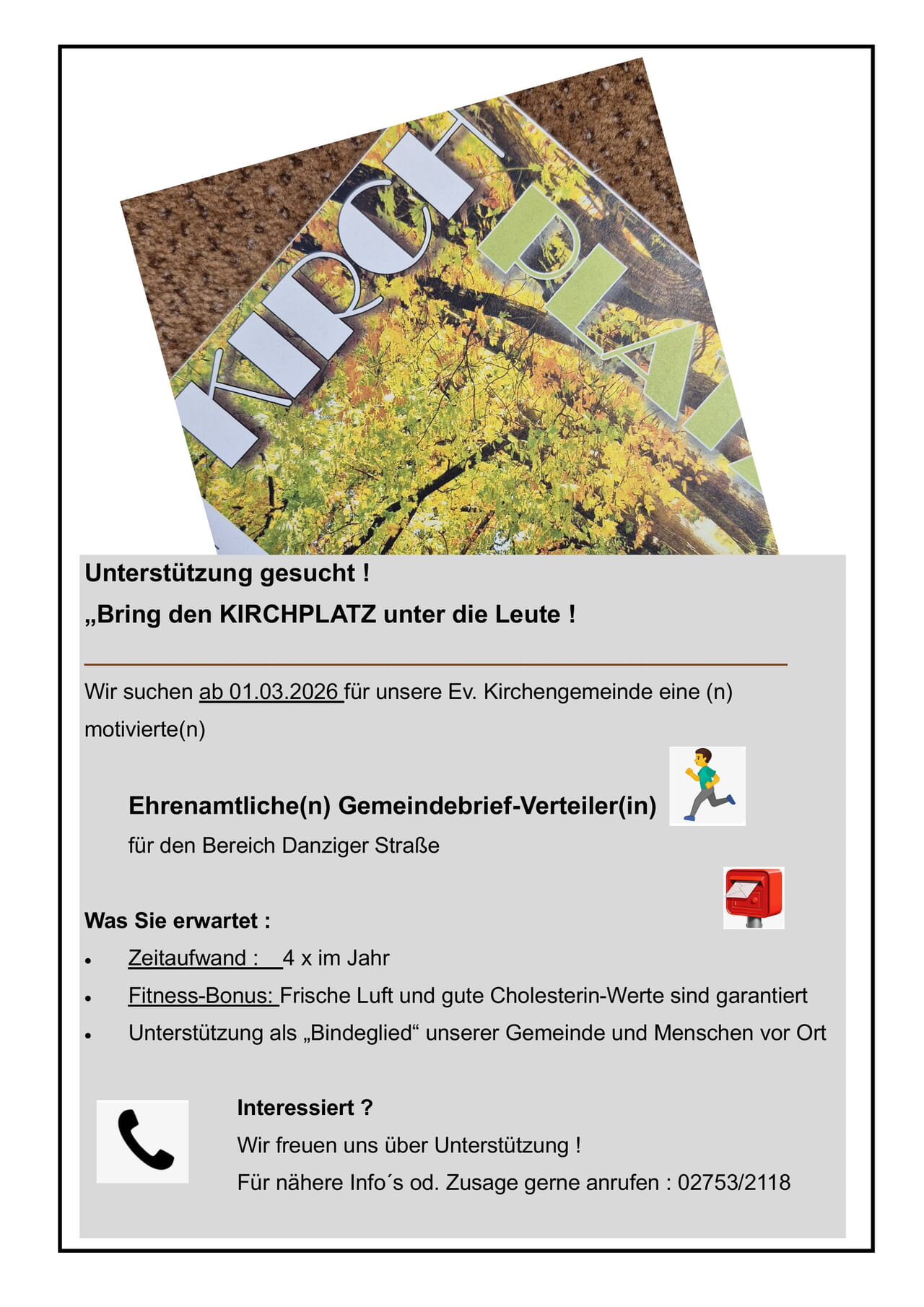 Wir suchen ab dem 1. März für unsere Ev. Kirchengemeinde einen oder eine motivierten Verteiler oder eine motivierte Verteilerin. Für dieses Ehrenamt suchen wir für den Bereich Danziger Straße lauffreudige Unterstützung.